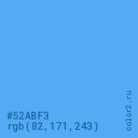 Цвет #52ABF3 в цветовой модели RGB обозначается тремя октетами (82, 171, 243) в десятичном формате и #52ABF3 в шестнадцатиричном (hex) формате, которые являются интенсивностью красного 82 (hex 52), интенсивность зелёного 171 (hex AB) и интенсивность синего 243 (hex F3).