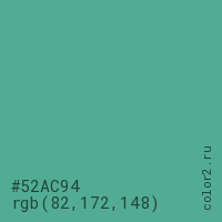 Цвет #52AC94 в цветовой модели RGB обозначается тремя октетами (82, 172, 148) в десятичном формате и #52AC94 в шестнадцатиричном (hex) формате, которые являются интенсивностью красного 82 (hex 52), интенсивность зелёного 172 (hex AC) и интенсивность синего 148 (hex 94).