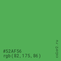 Цвет #52AF56 в цветовой модели RGB обозначается тремя октетами (82, 175, 86) в десятичном формате и #52AF56 в шестнадцатиричном (hex) формате, которые являются интенсивностью красного 82 (hex 52), интенсивность зелёного 175 (hex AF) и интенсивность синего 86 (hex 56).