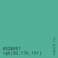 Цвет #52B097 в цветовой модели RGB обозначается тремя октетами (82, 176, 151) в десятичном формате и #52B097 в шестнадцатиричном (hex) формате, которые являются интенсивностью красного 82 (hex 52), интенсивность зелёного 176 (hex B0) и интенсивность синего 151 (hex 97).