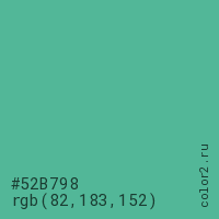 Цвет #52B798 в цветовой модели RGB обозначается тремя октетами (82, 183, 152) в десятичном формате и #52B798 в шестнадцатиричном (hex) формате, которые являются интенсивностью красного 82 (hex 52), интенсивность зелёного 183 (hex B7) и интенсивность синего 152 (hex 98).