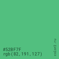 Цвет #52BF7F в цветовой модели RGB обозначается тремя октетами (82, 191, 127) в десятичном формате и #52BF7F в шестнадцатиричном (hex) формате, которые являются интенсивностью красного 82 (hex 52), интенсивность зелёного 191 (hex BF) и интенсивность синего 127 (hex 7F).