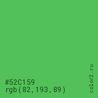 Цвет #52C159 в цветовой модели RGB обозначается тремя октетами (82, 193, 89) в десятичном формате и #52C159 в шестнадцатиричном (hex) формате, которые являются интенсивностью красного 82 (hex 52), интенсивность зелёного 193 (hex C1) и интенсивность синего 89 (hex 59).