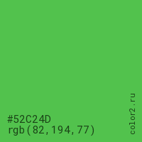 Цвет #52C24D в цветовой модели RGB обозначается тремя октетами (82, 194, 77) в десятичном формате и #52C24D в шестнадцатиричном (hex) формате, которые являются интенсивностью красного 82 (hex 52), интенсивность зелёного 194 (hex C2) и интенсивность синего 77 (hex 4D).