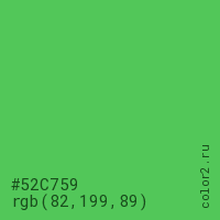 Цвет #52C759 в цветовой модели RGB обозначается тремя октетами (82, 199, 89) в десятичном формате и #52C759 в шестнадцатиричном (hex) формате, которые являются интенсивностью красного 82 (hex 52), интенсивность зелёного 199 (hex C7) и интенсивность синего 89 (hex 59).