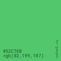 Цвет #52C76B в цветовой модели RGB обозначается тремя октетами (82, 199, 107) в десятичном формате и #52C76B в шестнадцатиричном (hex) формате, которые являются интенсивностью красного 82 (hex 52), интенсивность зелёного 199 (hex C7) и интенсивность синего 107 (hex 6B).