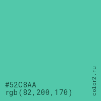 Цвет #52C8AA в цветовой модели RGB обозначается тремя октетами (82, 200, 170) в десятичном формате и #52C8AA в шестнадцатиричном (hex) формате, которые являются интенсивностью красного 82 (hex 52), интенсивность зелёного 200 (hex C8) и интенсивность синего 170 (hex AA).