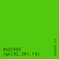 Цвет #52C90E в цветовой модели RGB обозначается тремя октетами (82, 201, 14) в десятичном формате и #52C90E в шестнадцатиричном (hex) формате, которые являются интенсивностью красного 82 (hex 52), интенсивность зелёного 201 (hex C9) и интенсивность синего 14 (hex 0E).