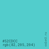 Цвет #52CDCC в цветовой модели RGB обозначается тремя октетами (82, 205, 204) в десятичном формате и #52CDCC в шестнадцатиричном (hex) формате, которые являются интенсивностью красного 82 (hex 52), интенсивность зелёного 205 (hex CD) и интенсивность синего 204 (hex CC).