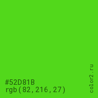 Цвет #52D81B в цветовой модели RGB обозначается тремя октетами (82, 216, 27) в десятичном формате и #52D81B в шестнадцатиричном (hex) формате, которые являются интенсивностью красного 82 (hex 52), интенсивность зелёного 216 (hex D8) и интенсивность синего 27 (hex 1B).