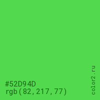 Цвет #52D94D в цветовой модели RGB обозначается тремя октетами (82, 217, 77) в десятичном формате и #52D94D в шестнадцатиричном (hex) формате, которые являются интенсивностью красного 82 (hex 52), интенсивность зелёного 217 (hex D9) и интенсивность синего 77 (hex 4D).