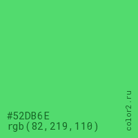 Цвет #52DB6E в цветовой модели RGB обозначается тремя октетами (82, 219, 110) в десятичном формате и #52DB6E в шестнадцатиричном (hex) формате, которые являются интенсивностью красного 82 (hex 52), интенсивность зелёного 219 (hex DB) и интенсивность синего 110 (hex 6E).