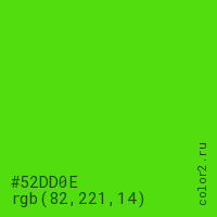 Цвет #52DD0E в цветовой модели RGB обозначается тремя октетами (82, 221, 14) в десятичном формате и #52DD0E в шестнадцатиричном (hex) формате, которые являются интенсивностью красного 82 (hex 52), интенсивность зелёного 221 (hex DD) и интенсивность синего 14 (hex 0E).