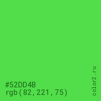 Цвет #52DD4B в цветовой модели RGB обозначается тремя октетами (82, 221, 75) в десятичном формате и #52DD4B в шестнадцатиричном (hex) формате, которые являются интенсивностью красного 82 (hex 52), интенсивность зелёного 221 (hex DD) и интенсивность синего 75 (hex 4B).