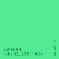 Цвет #52EB94 в цветовой модели RGB обозначается тремя октетами (82, 235, 148) в десятичном формате и #52EB94 в шестнадцатиричном (hex) формате, которые являются интенсивностью красного 82 (hex 52), интенсивность зелёного 235 (hex EB) и интенсивность синего 148 (hex 94).