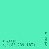 Цвет #52EFBB в цветовой модели RGB обозначается тремя октетами (82, 239, 187) в десятичном формате и #52EFBB в шестнадцатиричном (hex) формате, которые являются интенсивностью красного 82 (hex 52), интенсивность зелёного 239 (hex EF) и интенсивность синего 187 (hex BB).