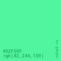 Цвет #52F59F в цветовой модели RGB обозначается тремя октетами (82, 245, 159) в десятичном формате и #52F59F в шестнадцатиричном (hex) формате, которые являются интенсивностью красного 82 (hex 52), интенсивность зелёного 245 (hex F5) и интенсивность синего 159 (hex 9F).