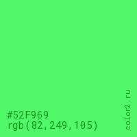 Цвет #52F969 в цветовой модели RGB обозначается тремя октетами (82, 249, 105) в десятичном формате и #52F969 в шестнадцатиричном (hex) формате, которые являются интенсивностью красного 82 (hex 52), интенсивность зелёного 249 (hex F9) и интенсивность синего 105 (hex 69).