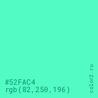 Цвет #52FAC4 в цветовой модели RGB обозначается тремя октетами (82, 250, 196) в десятичном формате и #52FAC4 в шестнадцатиричном (hex) формате, которые являются интенсивностью красного 82 (hex 52), интенсивность зелёного 250 (hex FA) и интенсивность синего 196 (hex C4).