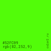 Цвет #52FC09 в цветовой модели RGB обозначается тремя октетами (82, 252, 9) в десятичном формате и #52FC09 в шестнадцатиричном (hex) формате, которые являются интенсивностью красного 82 (hex 52), интенсивность зелёного 252 (hex FC) и интенсивность синего 9 (hex 09).