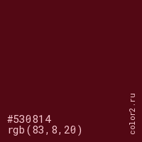 Цвет #530814 в цветовой модели RGB обозначается тремя октетами (83, 8, 20) в десятичном формате и #530814 в шестнадцатиричном (hex) формате, которые являются интенсивностью красного 83 (hex 53), интенсивность зелёного 8 (hex 08) и интенсивность синего 20 (hex 14).
