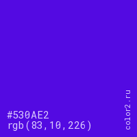 Цвет #530AE2 в цветовой модели RGB обозначается тремя октетами (83, 10, 226) в десятичном формате и #530AE2 в шестнадцатиричном (hex) формате, которые являются интенсивностью красного 83 (hex 53), интенсивность зелёного 10 (hex 0A) и интенсивность синего 226 (hex E2).