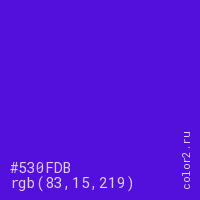 Цвет #530FDB в цветовой модели RGB обозначается тремя октетами (83, 15, 219) в десятичном формате и #530FDB в шестнадцатиричном (hex) формате, которые являются интенсивностью красного 83 (hex 53), интенсивность зелёного 15 (hex 0F) и интенсивность синего 219 (hex DB).