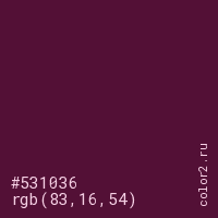 Цвет #531036 в цветовой модели RGB обозначается тремя октетами (83, 16, 54) в десятичном формате и #531036 в шестнадцатиричном (hex) формате, которые являются интенсивностью красного 83 (hex 53), интенсивность зелёного 16 (hex 10) и интенсивность синего 54 (hex 36).