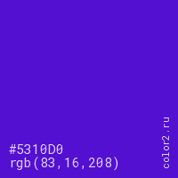 Цвет #5310D0 в цветовой модели RGB обозначается тремя октетами (83, 16, 208) в десятичном формате и #5310D0 в шестнадцатиричном (hex) формате, которые являются интенсивностью красного 83 (hex 53), интенсивность зелёного 16 (hex 10) и интенсивность синего 208 (hex D0).