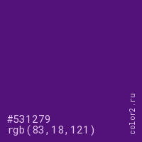 Цвет #531279 в цветовой модели RGB обозначается тремя октетами (83, 18, 121) в десятичном формате и #531279 в шестнадцатиричном (hex) формате, которые являются интенсивностью красного 83 (hex 53), интенсивность зелёного 18 (hex 12) и интенсивность синего 121 (hex 79).
