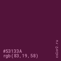 Цвет #53133A в цветовой модели RGB обозначается тремя октетами (83, 19, 58) в десятичном формате и #53133A в шестнадцатиричном (hex) формате, которые являются интенсивностью красного 83 (hex 53), интенсивность зелёного 19 (hex 13) и интенсивность синего 58 (hex 3A).