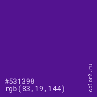 Цвет #531390 в цветовой модели RGB обозначается тремя октетами (83, 19, 144) в десятичном формате и #531390 в шестнадцатиричном (hex) формате, которые являются интенсивностью красного 83 (hex 53), интенсивность зелёного 19 (hex 13) и интенсивность синего 144 (hex 90).