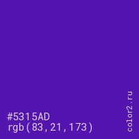 Цвет #5315AD в цветовой модели RGB обозначается тремя октетами (83, 21, 173) в десятичном формате и #5315AD в шестнадцатиричном (hex) формате, которые являются интенсивностью красного 83 (hex 53), интенсивность зелёного 21 (hex 15) и интенсивность синего 173 (hex AD).