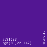 Цвет #531693 в цветовой модели RGB обозначается тремя октетами (83, 22, 147) в десятичном формате и #531693 в шестнадцатиричном (hex) формате, которые являются интенсивностью красного 83 (hex 53), интенсивность зелёного 22 (hex 16) и интенсивность синего 147 (hex 93).