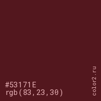 Цвет #53171E в цветовой модели RGB обозначается тремя октетами (83, 23, 30) в десятичном формате и #53171E в шестнадцатиричном (hex) формате, которые являются интенсивностью красного 83 (hex 53), интенсивность зелёного 23 (hex 17) и интенсивность синего 30 (hex 1E).