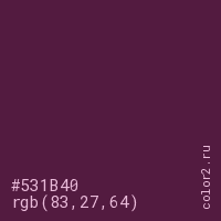 Цвет #531B40 в цветовой модели RGB обозначается тремя октетами (83, 27, 64) в десятичном формате и #531B40 в шестнадцатиричном (hex) формате, которые являются интенсивностью красного 83 (hex 53), интенсивность зелёного 27 (hex 1B) и интенсивность синего 64 (hex 40).