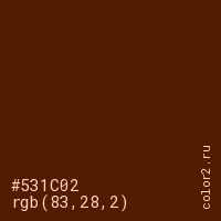 Цвет #531C02 в цветовой модели RGB обозначается тремя октетами (83, 28, 2) в десятичном формате и #531C02 в шестнадцатиричном (hex) формате, которые являются интенсивностью красного 83 (hex 53), интенсивность зелёного 28 (hex 1C) и интенсивность синего 2 (hex 02).