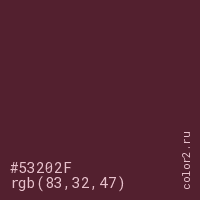 Цвет #53202F в цветовой модели RGB обозначается тремя октетами (83, 32, 47) в десятичном формате и #53202F в шестнадцатиричном (hex) формате, которые являются интенсивностью красного 83 (hex 53), интенсивность зелёного 32 (hex 20) и интенсивность синего 47 (hex 2F).