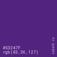 Цвет #53247F в цветовой модели RGB обозначается тремя октетами (83, 36, 127) в десятичном формате и #53247F в шестнадцатиричном (hex) формате, которые являются интенсивностью красного 83 (hex 53), интенсивность зелёного 36 (hex 24) и интенсивность синего 127 (hex 7F).