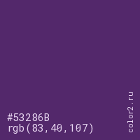 Цвет #53286B в цветовой модели RGB обозначается тремя октетами (83, 40, 107) в десятичном формате и #53286B в шестнадцатиричном (hex) формате, которые являются интенсивностью красного 83 (hex 53), интенсивность зелёного 40 (hex 28) и интенсивность синего 107 (hex 6B).