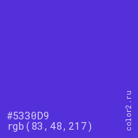 Цвет #5330D9 в цветовой модели RGB обозначается тремя октетами (83, 48, 217) в десятичном формате и #5330D9 в шестнадцатиричном (hex) формате, которые являются интенсивностью красного 83 (hex 53), интенсивность зелёного 48 (hex 30) и интенсивность синего 217 (hex D9).