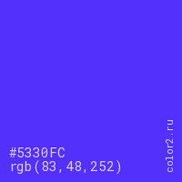 Цвет #5330FC в цветовой модели RGB обозначается тремя октетами (83, 48, 252) в десятичном формате и #5330FC в шестнадцатиричном (hex) формате, которые являются интенсивностью красного 83 (hex 53), интенсивность зелёного 48 (hex 30) и интенсивность синего 252 (hex FC).