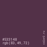 Цвет #533148 в цветовой модели RGB обозначается тремя октетами (83, 49, 72) в десятичном формате и #533148 в шестнадцатиричном (hex) формате, которые являются интенсивностью красного 83 (hex 53), интенсивность зелёного 49 (hex 31) и интенсивность синего 72 (hex 48).