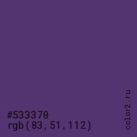 Цвет #533370 в цветовой модели RGB обозначается тремя октетами (83, 51, 112) в десятичном формате и #533370 в шестнадцатиричном (hex) формате, которые являются интенсивностью красного 83 (hex 53), интенсивность зелёного 51 (hex 33) и интенсивность синего 112 (hex 70).