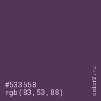Цвет #533558 в цветовой модели RGB обозначается тремя октетами (83, 53, 88) в десятичном формате и #533558 в шестнадцатиричном (hex) формате, которые являются интенсивностью красного 83 (hex 53), интенсивность зелёного 53 (hex 35) и интенсивность синего 88 (hex 58).
