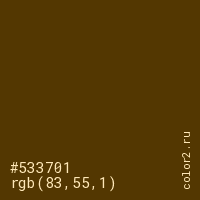 Цвет #533701 в цветовой модели RGB обозначается тремя октетами (83, 55, 1) в десятичном формате и #533701 в шестнадцатиричном (hex) формате, которые являются интенсивностью красного 83 (hex 53), интенсивность зелёного 55 (hex 37) и интенсивность синего 1 (hex 01).