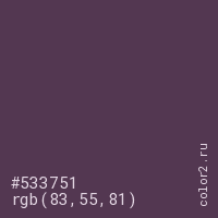 Цвет #533751 в цветовой модели RGB обозначается тремя октетами (83, 55, 81) в десятичном формате и #533751 в шестнадцатиричном (hex) формате, которые являются интенсивностью красного 83 (hex 53), интенсивность зелёного 55 (hex 37) и интенсивность синего 81 (hex 51).