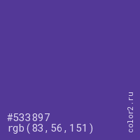 Цвет #533897 в цветовой модели RGB обозначается тремя октетами (83, 56, 151) в десятичном формате и #533897 в шестнадцатиричном (hex) формате, которые являются интенсивностью красного 83 (hex 53), интенсивность зелёного 56 (hex 38) и интенсивность синего 151 (hex 97).