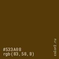 Цвет #533A08 в цветовой модели RGB обозначается тремя октетами (83, 58, 8) в десятичном формате и #533A08 в шестнадцатиричном (hex) формате, которые являются интенсивностью красного 83 (hex 53), интенсивность зелёного 58 (hex 3A) и интенсивность синего 8 (hex 08).