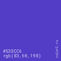 Цвет #533CC6 в цветовой модели RGB обозначается тремя октетами (83, 60, 198) в десятичном формате и #533CC6 в шестнадцатиричном (hex) формате, которые являются интенсивностью красного 83 (hex 53), интенсивность зелёного 60 (hex 3C) и интенсивность синего 198 (hex C6).